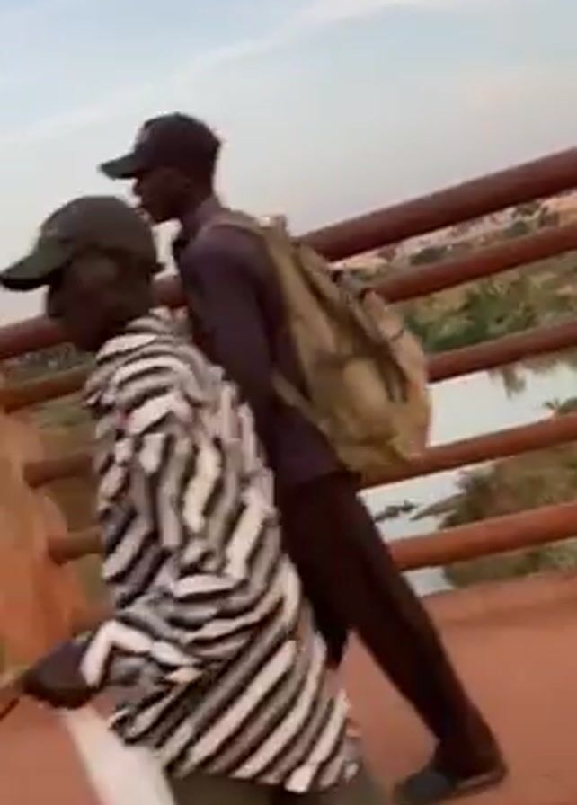 The video depicts a view from what appears to be a bridge, looking down at a river. The railing of the bridge is made of red metal and consists of horizontal bars. The river below appears relatively shallow, with grassy vegetation visible on its banks. The sky is a pale blue with some wispy clouds. The overall environment seems arid or semi-arid. There is no dialogue and no evident interaction.