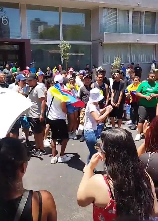 lively street gathering on a sunny day with many people dancing and waving Venezuelan flags. The crowd is diverse in age and clothing, many wearing hats and caps. Some people are holding drinks in yellow cups. The street is paved and bordered by buildings, including one with large windows and a visible address number "76". Above the crowd, a small group can be seen watching from a balcony. Several bystanders appear to be filming the celebration with their phones.