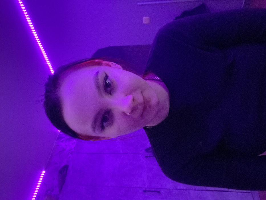 A young woman with a nose piercing looks at the camera in a selfie-style image. She has dark hair with red highlights peeking through and is wearing a dark-colored, long-sleeved shirt. The room is lit with a purple glow, likely from LED lights visible in the background. A section of the room is a light color, and there appears to be a sofa or chair behind her. The image is rotated counter-clockwise.