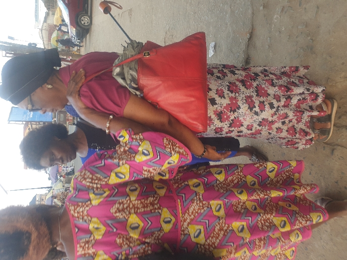 Three women stand together in what appears to be a market area. The woman closest to the viewer wears a vibrant pink dress with geometric patterns. Behind her, another woman is dressed in black and blue. The third woman, in the back, has on a red purse and a long floral skirt. The background features cars, a building, and other people in the vicinity.