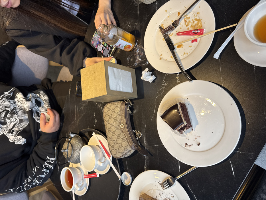 A black marble-patterned tabletop is viewed from a high-angle perspective, consistent with a cafe or restaurant setting in Yerevan, Armenia. Two individuals are partially visible. On the left, a person wears a black long-sleeved shirt featuring a large white graphic print resembling architectural or mechanical schematics, with white text visible on the sleeve. Their hands rest on the table. On the right, a second person, identifiable by long dark hair and a black long-sleeved top, has a hand positioned near a smartphone and a beverage bottle. The table contains items suggesting a dessert and beverage service. A black tray on the left holds a white ceramic teacup filled with dark amber tea, an empty white ceramic cup, and a dark, textured cast-iron teapot. A beige Gucci monogrammed purse with a gold interlocking G logo and a chain strap is centrally located. Adjacent to it is a light brown cardboard napkin dispenser containing white napkins. Two white circular plates are present. The plate on the center-left holds a partially eaten slice of chocolate cake with a dark chocolate glaze and a visible lighter cream layer, accompanied by a silver fork. The plate on the center-right is largely cleared but exhibits remnants of cake crumbs, indicating consumption, with a silver knife and fork resting upon it. Further right, a clear glass bottle containing orange liquid, with "avan" partially legible on its label (consistent with Javan juice, a brand common in Armenia), is positioned near a smartphone displaying app icons. A crumpled white paper napkin and a small clear plastic lid are also visible. A white ceramic cup containing amber liquid is partially visible at the bottom right, next to a white plastic straw and several wooden cocktail picks, some with red tips.