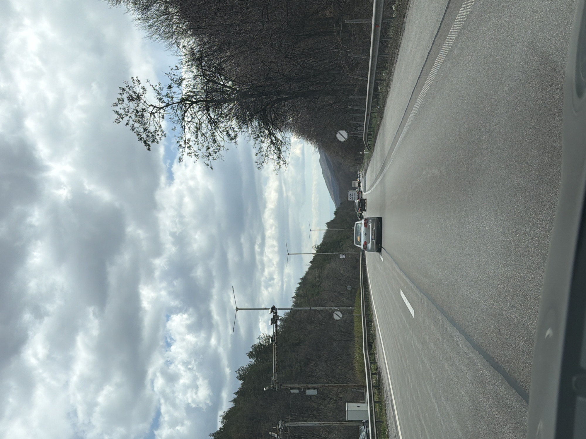 highway in Dolna Vasilitsa, Bulgaria. The view is taken from inside a vehicle moving along the road. There is a silver car on the road in front. The road has a metal safety barrier on one side, and trees and utility poles are visible on the other side. A cloudy sky is visible above the treeline.