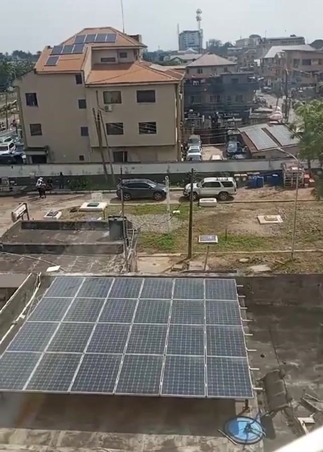 n urban landscape with several buildings. The building directly in front of the camera has solar panels on its rooftop. Another building in the background also has solar panels. There are several cars parked in a lot between the buildings. The sky is overcast. People can be seen walking near the parked cars.