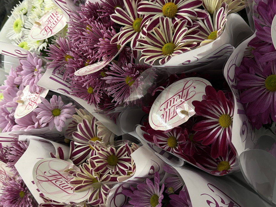 An overhead shot shows multiple flower bouquets. The bouquets feature flowers in shades of white, light purple, deep purple, and purple with white stripes. Each bunch is wrapped in clear plastic with a white label that has purple writing on it. The flowers all have yellow centers. The bundles are arranged closely, creating a dense and vibrant floral display.