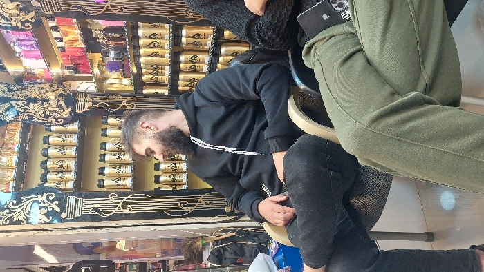 - "A man with a beard wearing a black hoodie and black jeans sits in a store with shelves of perfumes" by FM-kqxKp1, licensed under CC BY 4.0