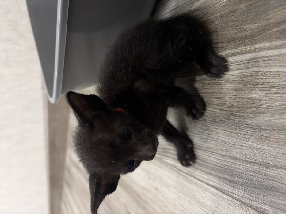 - "The scene depicts a small, black kitten with prominent, wide-set ears and light-colored eyes, wearing a thin red collar around its neck" by FM-6ulUg2, licensed under CC BY 4.0