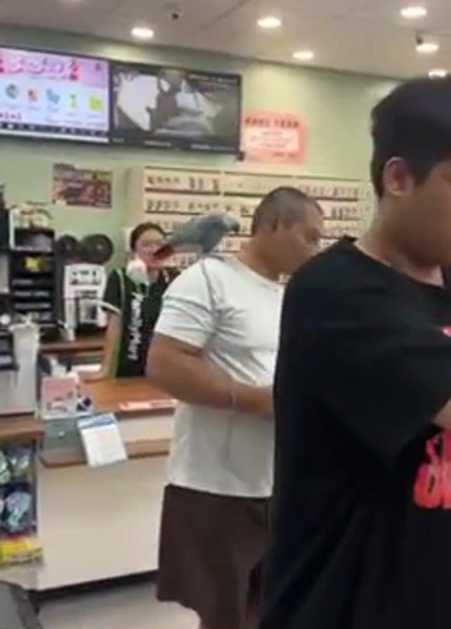 A man stands in line at a convenience store with a gray parrot perched on his shoulder