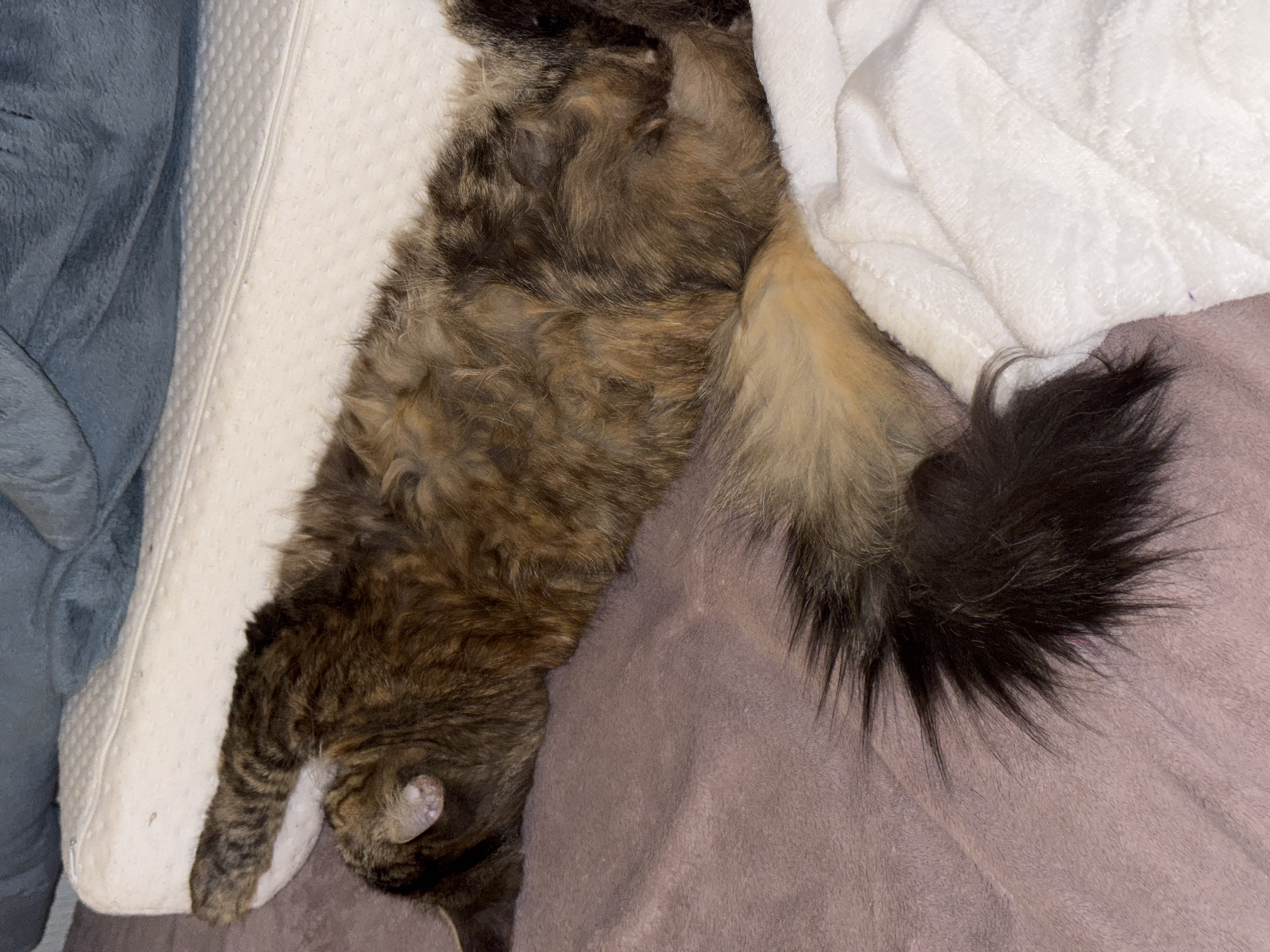 In a room located in Murino, Russia, a long-haired domestic cat is observed resting on its back on a bed. The cat's fur displays a mottled pattern of brown, black, and tan/ginger. It is stretched horizontally across the frame, with its head turned to the left, revealing one visible ear. Its front paws are extended upwards and outward. The cat lies primarily on a light purple, textured blanket. Behind the cat's head and upper body, a white, dimpled mattress pad is visible. A dark blue or grey plush blanket or pillow occupies the upper background. The cat's bushy tail, predominantly dark brown/black with a lighter tan/ginger section near its base, rests on a white, fluffy blanket positioned to the right of the cat's body.