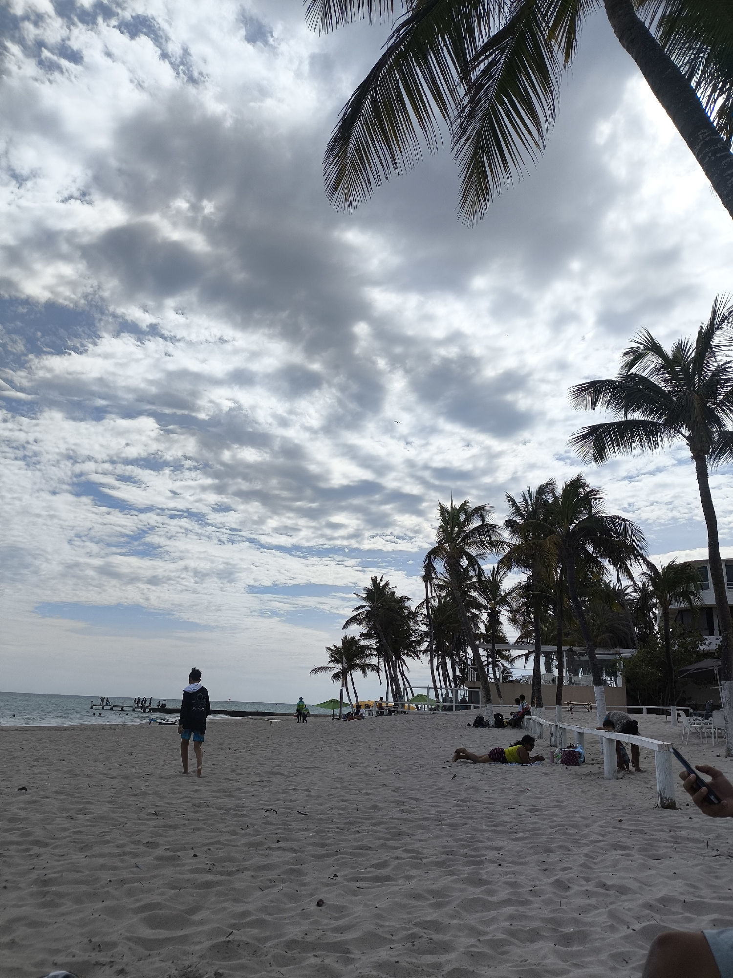 beach scene in El Yaque, Venezuela. The sky is filled with a mix of dark and light clouds. In the foreground, there is sand with visible footprints. A person is walking away from the camera towards the water, and a few people are relaxing on the beach. Palm trees line the beach, and a building is visible in the background. There are also some white fences and umbrellas scattered along the shore.