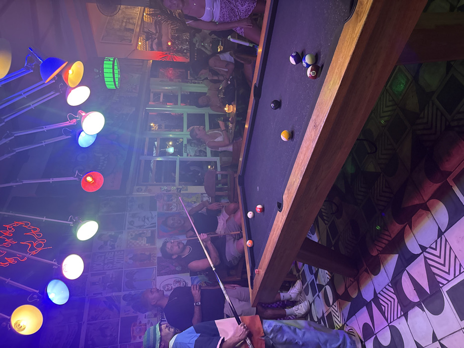 The image depicts an indoor nightlife scene within a bar or lounge in Uluwatu, Indonesia, characterized by vibrant, multi-colored artificial lighting. The central focus is a wooden pool table with a dark felt surface, where several pool balls are scattered, including a yellow solid, a black solid, two white balls (one with red markings), and two striped balls (blue/white, red/white). A red die is visible near one pocket. Four individuals are prominent in the foreground around the pool table. From left to right: 1. A male, partially visible, wearing a multi-colored striped shirt and a light green crocheted bucket hat, holding a pool cue vertically. 2. A male with dark skin, wearing a black t-shirt and light shorts, holding a glass. 3. A male with dark hair and a beard, wearing a dark tank top and light shorts, holding a pool cue horizontally as if preparing to take a shot. 4. A female with dark hair, wearing a dark top and light shorts, seated next to the cue-wielding male and smiling towards him. In the background, several other patrons are seated at wooden tables, some appearing to be eating or drinking. One table features a lit candle. The establishment's walls are covered densely with black and white posters featuring various graphics, text, and faces. Overhead, a collection of multi-colored industrial-style lamps (yellow, blue, white, green, red) provides illumination, complemented by a red neon flame sign. A green-framed window or door structure is visible in the background, with foliage suggesting an outdoor view. The floor features a distinct geometric pattern of black, white, and grey tiles.