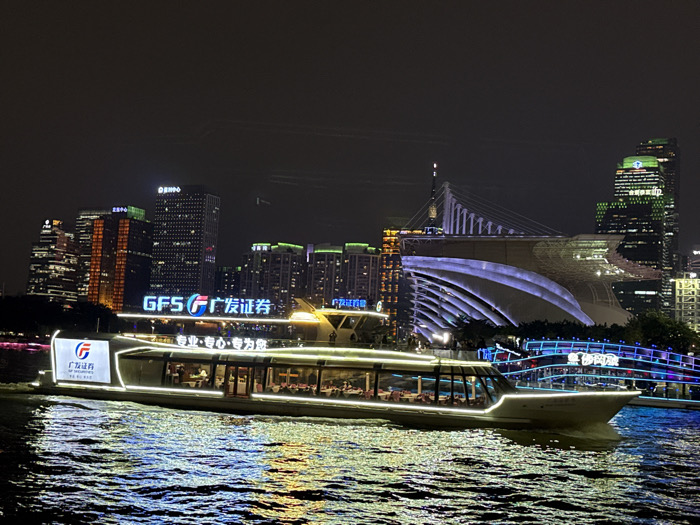 A night-time, wide-angle image captures a well-lit passenger vessel navigating a river in the urban landscape of Haizhu District, Guangzhou, China