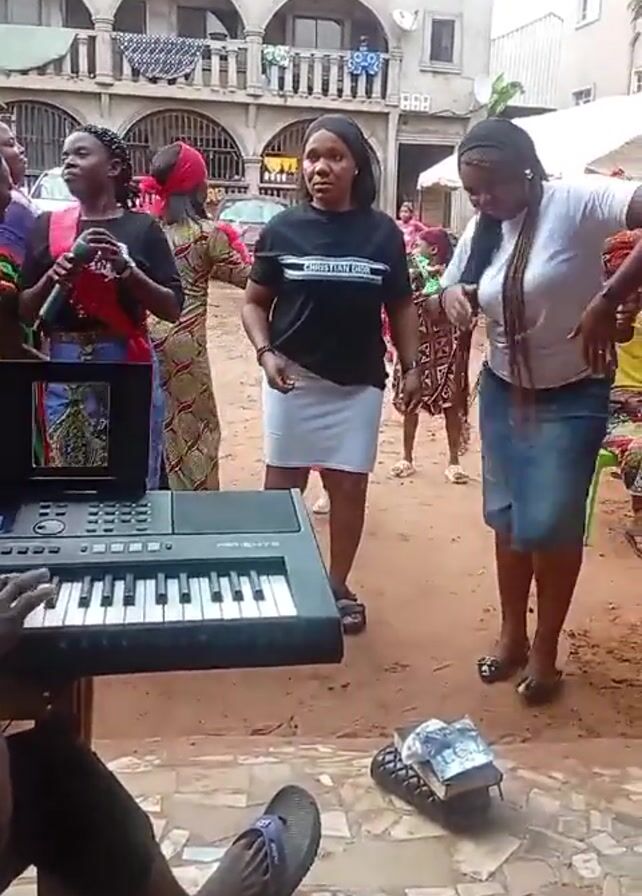 group of women dancing to music provided by a keyboard player in an outdoor setting. Several women are dancing near the keyboard, and there are other people watching in the background. The keyboard is placed on a stand with a laptop open next to it. Money is piled at the base of the keyboard stand. The setting appears to be a yard or open area in front of a multi-story building, and the ground is covered with cracked concrete slabs.