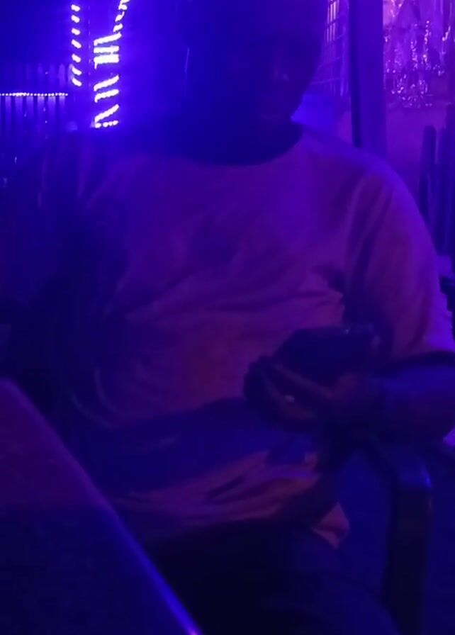 A person is seated at a table outdoors under bright purple lighting, looking down at a phone they hold in both hands