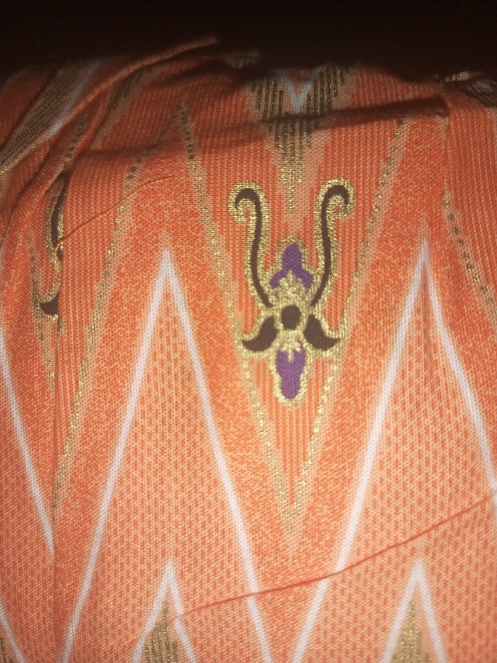 The scene depicts a close-up, slightly angled view of a textured textile, likely fabric, with prominent decorative patterns. The primary color of the fabric is a warm orange, ranging from lighter peach tones to deeper orange hues. Interspersed across the orange background are diagonal and chevron-like patterns in white, creating a series of inverted 'V' shapes. Fine, shimmering gold or bronze dashed lines run vertically and diagonally, often bordering or accentuating the white patterns. A central, symmetrical motif is prominent, rendered in gold/bronze, dark brown, and purple. This motif features two upward-curving, scroll-like elements in gold with dark brown outlines, flanking a central circular element. Below the central circle, a small, inverted teardrop or petal shape in purple is outlined in dark brown, with two smaller, dark brown stylized leaf-like elements extending horizontally from the central circle. The fabric itself exhibits a fine, regular weave or knit pattern, creating a slightly dotted or textured surface. Subtle folds and creases are visible, particularly in the upper left and bottom right portions, suggesting the fabric is draped or part of an item rather than laid perfectly flat. The background is dark and out of focus, emphasizing the patterned textile. The image is a close-up of the fabric, providing no discernible background or environmental context to identify its location within the city of Zee Pin Kone, Myanmar.