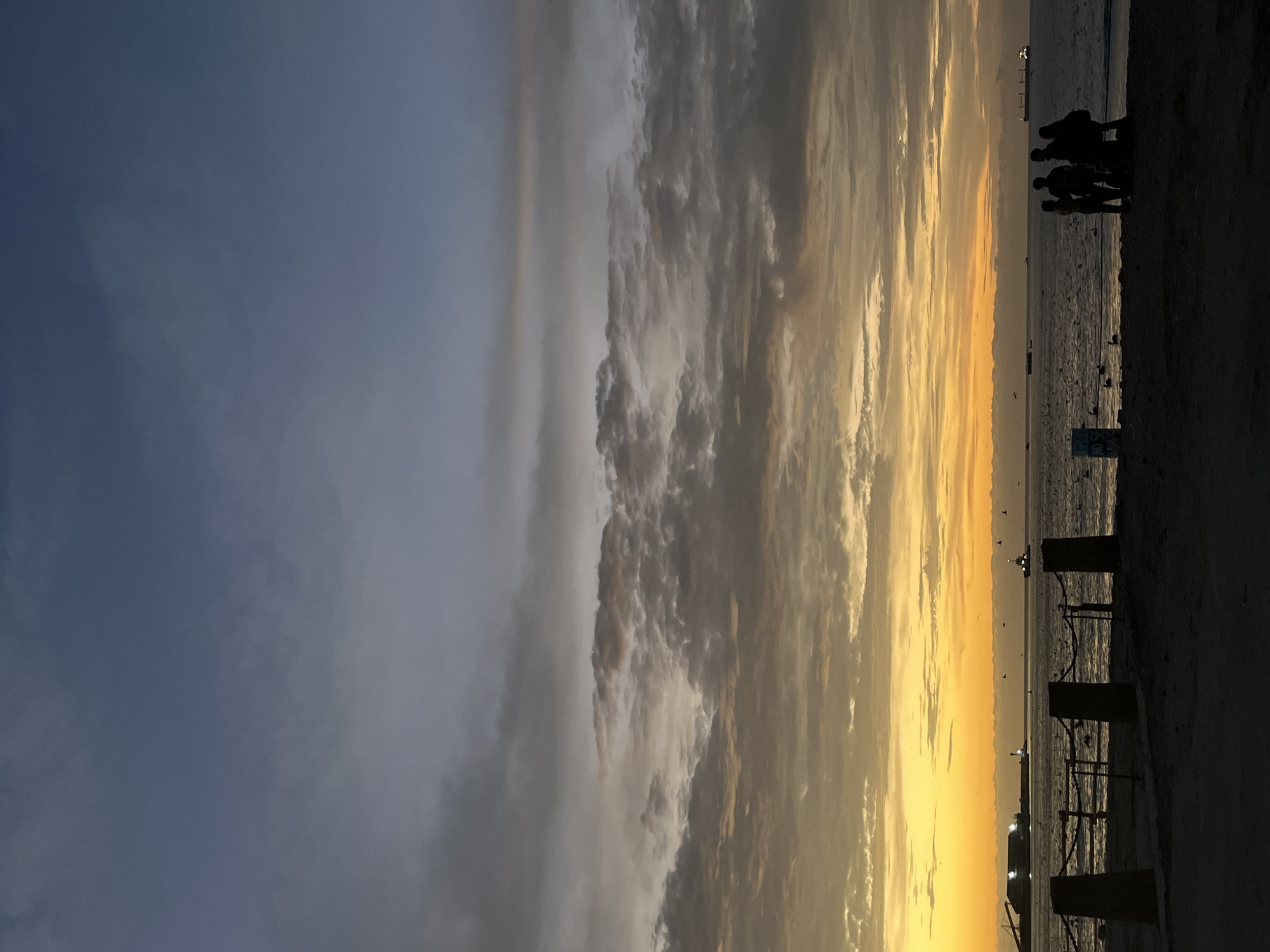 sunset scene in Arica, Chile. The sky is divided into two sections, the left is a cloudy blue-grey, and the right is a vivid yellow-orange from the sunset. There are several dark silhouettes of people standing on the shore. A railing is visible near the beach. In the distance, faint lights and objects are visible over the water.