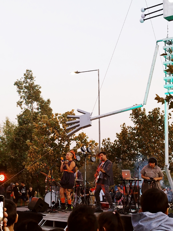A band performs on an outdoor stage at dusk. A female singer with orange accents stands at the microphone, a guitarist to her right, and another band member on the far right. A drum set is visible behind them. An oversized mechanical hand extends from a tall structure behind the stage. A street lamp and trees frame the scene. An audience is visible in the foreground and background, some holding up phones.