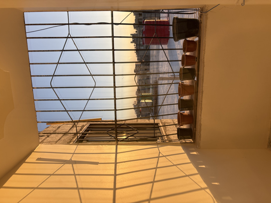 The image depicts a view from an interior space looking out over rooftops in Mu'adammiyat ash-Sham, Syria, during golden hour lighting. The foreground features a light-colored wall on the left, illuminated by warm, low-angle sunlight, casting distinct grid-like shadows from metal security bars. A window with additional bars is recessed into the far-left wall. Directly in front of the viewer, a wide window or balcony opening is secured by dark metal bars, arranged vertically with a central diamond-shaped pattern. On the concrete ledge below these bars, a row of eight empty flower pots is arranged from left to right, varying in size and color, including black, terracotta, and dark green. A white electrical wire runs vertically along the right side of the window frame. Beyond the window bars, a cityscape unfolds under a sky transitioning from light blue at the top to warm orange and yellow hues near the horizon. Prominent on the rooftops are a large red cylindrical water tank on the right and a smaller, light green cylindrical water tank further left. The rooftops below appear as a relatively flat, light-colored expanse. Distant buildings form a dense skyline. No people, discernible actions, or interactions are visible in the scene.