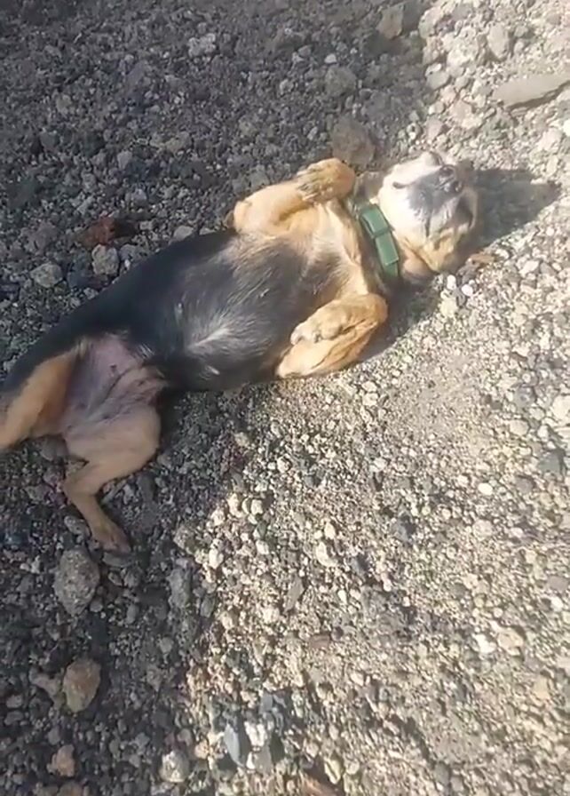 A tan and black dog, wearing a green collar, lies on its back on a gravel surface. The dog rolls over onto its side and curls up.