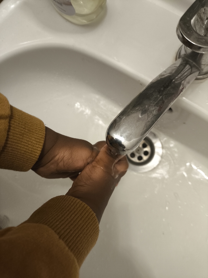 - "A top-down, close-up image captures a person's hands, exhibiting a dark skin tone, washing under a flowing chrome faucet in a white ceramic sink" by FM-QZ3z23, licensed under CC BY 4.0