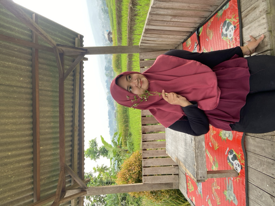 An adult female is depicted seated within an elevated, open-sided wooden gazebo or shelter, located in the city of Penanggungan, Indonesia. The structure features a corrugated roof, rough-hewn wooden posts, beams, and floorboards. A weathered rectangular wooden table is positioned directly in front of the subject. A red mat, decorated with cartoon animal illustrations including pandas and giraffes, is spread on the wooden floor to the subject's left and partially beneath the table. The female wears a dark red hijab, a black long-sleeved top, and dark pants. She holds a small cluster of green stems with tiny white flowers in her right hand, resting near her chest. She is looking slightly to her right (viewer's left) with a subtle smile. Behind the structure, a rural landscape unfolds, dominated by terraced green rice paddies that extend into the distance. Lush green foliage, including banana plants and bushes with reddish-brown leaves, is visible to the left. A small, rustic building with a light-colored roof is discernible among the rice fields. The distant horizon is characterized by hazy mountains or hills under an overcast sky.