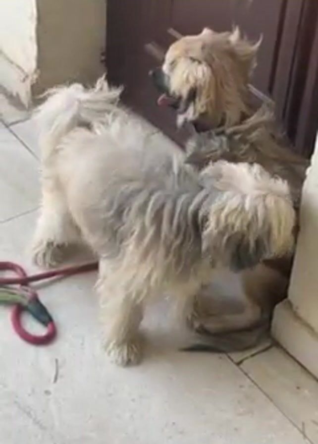 Two small dogs are standing on a tiled floor next to a closed brown door. One dog is light grey, the other is brown. The grey dog turns around. The brown dog sits down. A colorful dog leash lies on the floor next to the dogs.