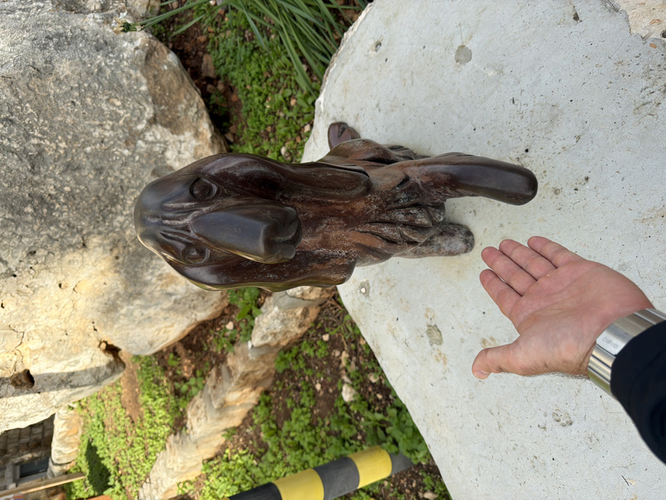 The image displays an outdoor scene located in the Hof HaCarmel Regional Council, Israel. A dark brown, stylized statue of a dog, characterized by long, droopy ears and a prominent snout, is positioned centrally, sitting upright on a light gray, textured, flat surface. In the lower-left foreground, a human left hand, adorned with a silver-toned metal watch featuring a link bracelet, extends towards the dog statue with its palm open and facing upwards. The immediate background behind the statue and surface features an area of green ground cover and exposed soil, segmented by a low, weathered stone or concrete border. Further back, large, light-colored natural rock formations are visible. A portion of a building with a visible window is present in the upper-left background, and a vertical object with alternating black and yellow stripes is partially visible on the far left. The scene is illuminated by natural daylight, casting subtle shadows.
