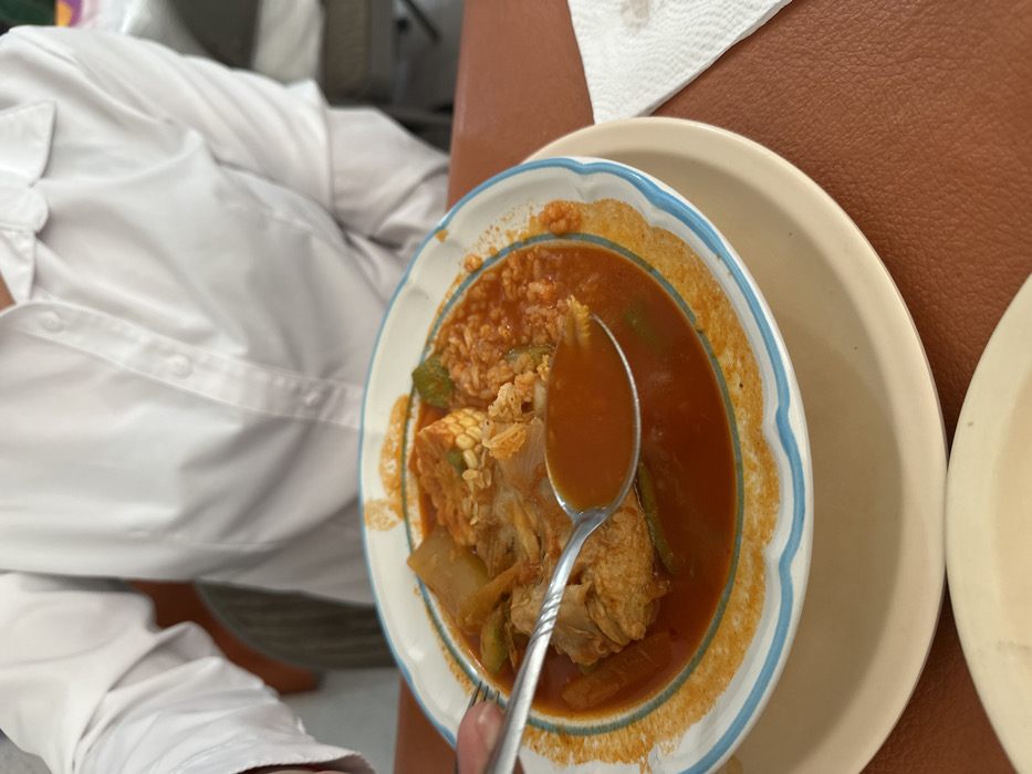 A partially eaten bowl of cocido soup sits on a beige plate, placed atop a brown table next to a person in a white button-down shirt. The bowl features a blue and white rim. Inside, red broth surrounds large chunks of chicken, corn on the cob, rice, and sliced vegetables. A silver spoon dips into the soup, holding a small amount of the red broth. A white napkin sits in the corner of the table.