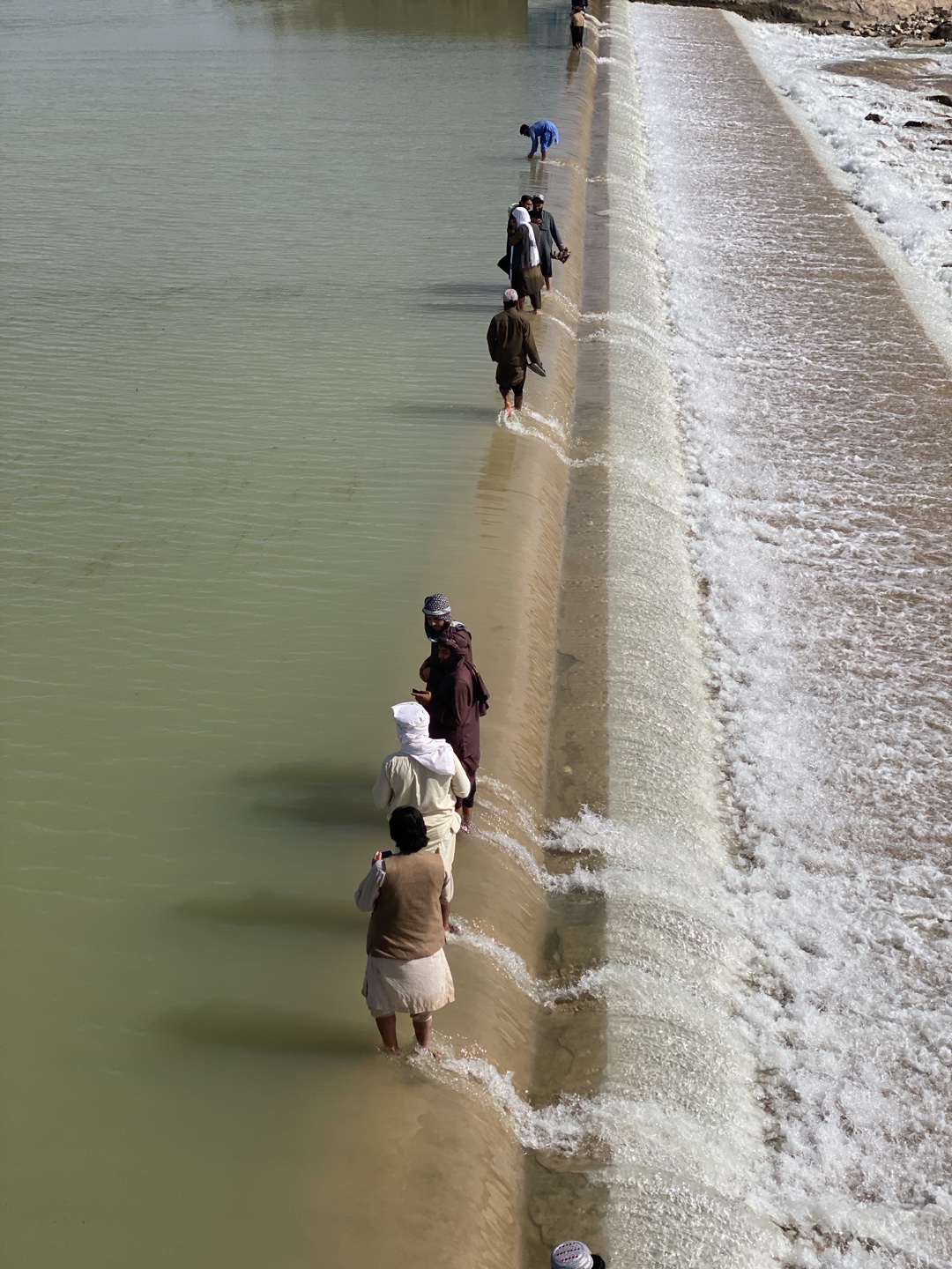 A high-angle, long-shot photograph shows a line of several men crossing a dam in what appears to be a river. The location is in the city of Kim, Afghanistan. The water is a muddy green color and flows from left to right. The men are wading through the water as they walk along the dam's edge, some are dressed in traditional Afghan attire, including long robes and head coverings. The sky is not visible, but the light suggests a bright, sunny day. The dam is made of concrete and has water flowing over its edge.
