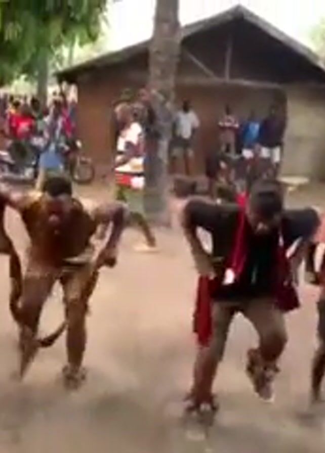 Five men are performing a dance in a dirt clearing. They are leaping in the air with bent knees and their hands on their hips. The man in the center is wearing what appears to be animal skin around his legs. The other men are wearing a white tank top, a floral button-down shirt with a red hat, a black shirt with a red sash, and a brown printed t-shirt. There are many people watching them from the background. Behind them is a simple structure made of mud bricks. There is also a motorcycle parked in the background. It appears to be daytime.