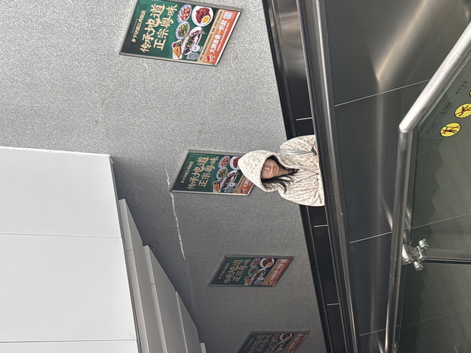 A woman in a patterned hoodie stands on an escalator. Behind her is a gray wall with several signs that advertise food from a restaurant called "Xiang Xia Zi Zhanjiang Chicken Restaurant." The signs are green with images of various dishes and the text "Inheriting Authentic Flavors" and "Authentic Cantonese Flavors." A sign on the escalator has a warning symbol.