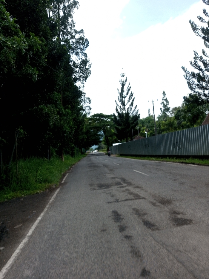 This image displays a paved, two-lane asphalt road in Ariyalai, Sri Lanka, viewed from a low perspective looking forward into the distance. The road surface exhibits multiple dark, irregular stains and patches. A continuous white line marks the left edge of the road, while a broken white line is visible further ahead, delineating the center of the roadway. To the immediate left of the road, a dense barrier of dark green foliage, consisting of numerous tall trees and undergrowth, extends along the roadside. Thin, pale vertical elements are partially discernible within this vegetation. To the immediate right, a long, light grey corrugated metal fence runs parallel to the road. Behind this fence, several trees are visible, including a prominent, tall, and slender conifer, alongside at least two utility poles. In the mid-distance, a dark-colored motorcycle is positioned centrally on the road, traveling away from the viewer. No other individuals or active vehicles are present in the visible foreground or mid-ground. The distant horizon features indistinct treelines and a bright, predominantly white sky.