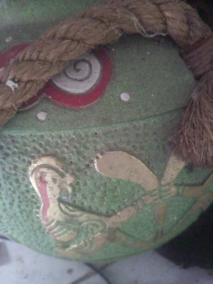 This close-up image depicts a portion of a textured, dark green object, likely ceramic or stone, adorned with decorative elements and a section of rope. The green surface features a prominent white spiral design centered within a red ring, located in the upper-central area. Two smaller white circular dots are visible near this motif. Below this, an embossed, metallic-gold colored depiction of a stylized anthropomorphic figure is present. This figure is shown in profile, facing left, with an elongated headpiece containing a vertical reddish-pink stripe. The figure appears to be holding a bladed instrument, possibly a cleaver or hatchet, rendered in gold, with an additional gold, elongated, teardrop-shaped element to its right. The green surface exhibits a granular or pitted texture, suggesting age or manufacturing process. A thick, three-strand braided rope, light brown in color and made of natural fibers, is draped diagonally across the upper part of the object, partially obscuring the red and white spiral design. The end of the rope on the right side of the image is frayed. The background is out of focus, consisting of blurred grey and dark tones, providing no specific environmental details. There are no people visible. The image offers no discernible visual information to identify a specific location within the city of Zee Pin Kone, Myanmar.