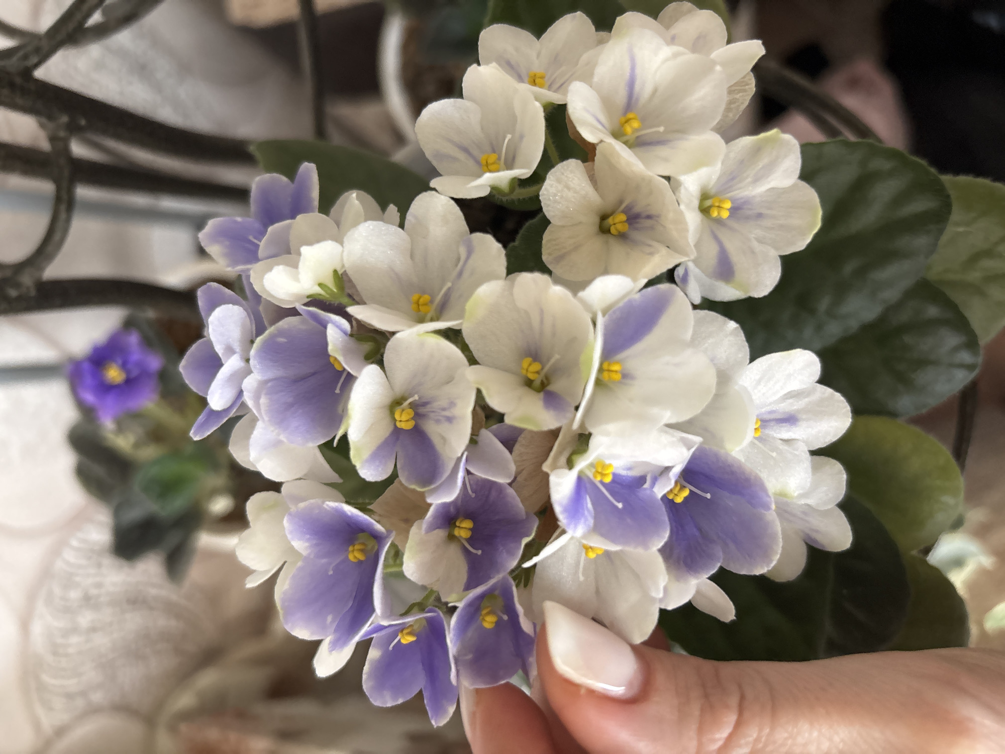 A close-up photograph shows a cluster of African violet flowers in shades of white and lavender with yellow centers, held by a person's hand with a manicured nail