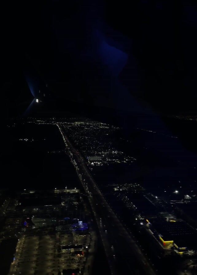n aerial view of a city at night, taken from an airplane window. Bright spots of light outline streets, buildings, and cars, contrasting with the darkness of the surrounding land. A major road with steady streams of headlights and taillights stretches into the distance. In the foreground, there is a large building with a brightly lit parking lot. The wing of the plane is faintly visible in the upper left corner of the frame. The overall scene is urban, with a clear demarcation between lit areas and dark spaces.