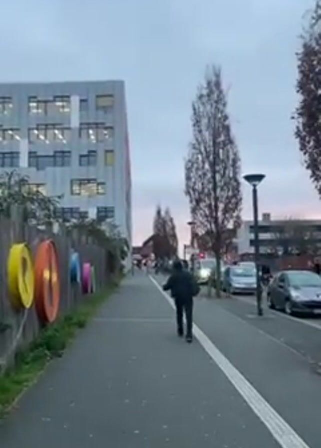 A person in dark clothing is walking away from the camera on a sidewalk
