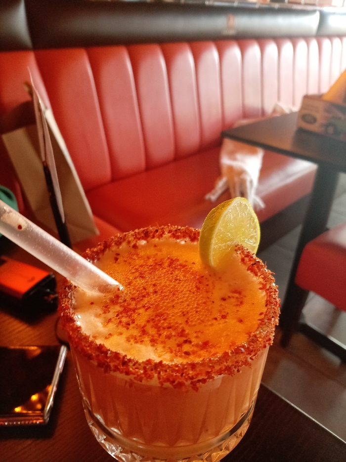 A close-up photograph displays a beverage served in a clear, textured glass on a dark, reflective table surface within a restaurant or bar in Corby, United Kingdom. The drink is an orange-hued liquid with a frothy top, extensively garnished with red granular seasoning, consistent with chili powder or Tajín, both sprinkled on its surface and encrusting the glass rim. A lime wedge is affixed to the rim, and a clear plastic straw is inserted into the drink. To the left of the glass, a dark orange and black object, possibly a vape device or lighter, is partially visible, alongside a reflective dark item, likely a mobile phone or case. A light-colored paper bag or menu leans vertically against an unseen object in the midground on the left. The background features a long, padded booth with bright red, vertically-paneled upholstery and a dark brown/black upper section. Further right, a dark rectangular table is visible, accompanied by a chair with a red seat. A white folded item and a multi-colored box are discernible on this distant table. No individuals or direct interactions are depicted in the scene.