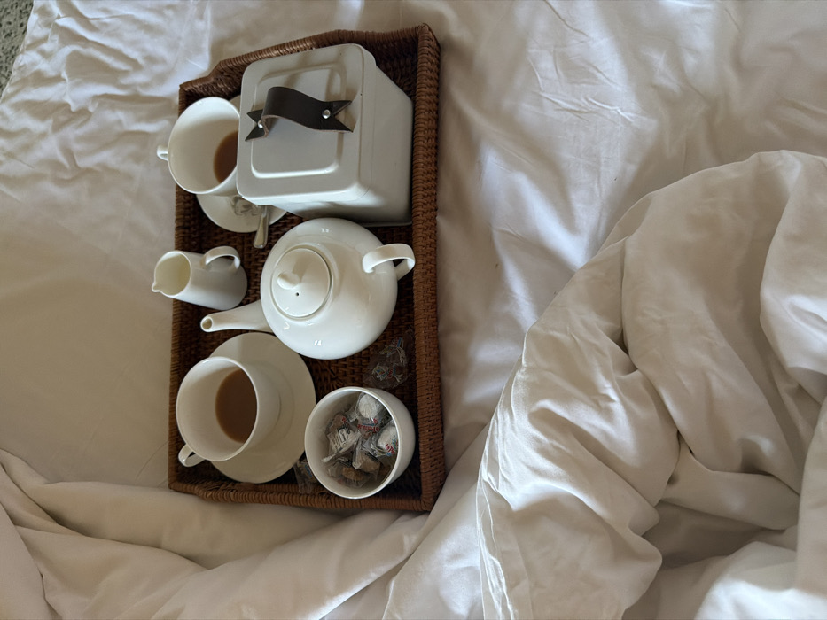 - "A woven rectangular brown tray, laden with a white porcelain tea service and other items, rests on a bed covered by rumpled white linens in West Oxfordshire, United Kingdom" by FM-xILGl2, licensed under CC BY 4.0