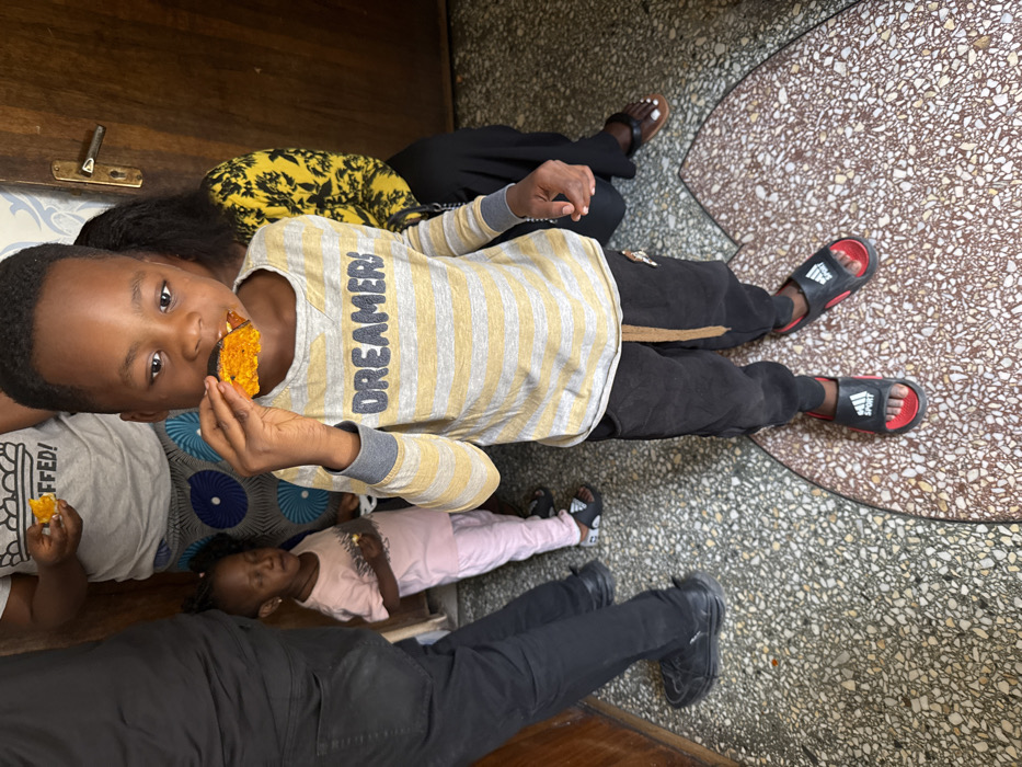 An indoor scene features a group of five individuals, primarily children, in what appears to be a corridor or entryway. A young male child, approximately 4-7 years old, stands centrally in the foreground, wearing a light yellow and gray striped long-sleeved shirt with "DREAMERS" printed on the chest, dark cargo pants, and red and black Adidas slides. He is actively eating a piece of irregular, orange-colored fried food, holding it to his mouth with his right hand. His gaze is directed slightly downwards. Behind and to the left of the central boy is a younger female child, about 2-4 years old, dressed in a light pink top and matching pants, with black and white Adidas slides. She holds a small, light-colored object near her mouth and observes the central boy. Three adults are partially visible in the background. On the far left, only the lower torso and legs of an individual in black attire are seen. Behind the children, an adult in a gray t-shirt with a partially visible "FFED!" inscription and a blue and white patterned skirt is also holding a piece of the orange food. To the right, another adult is seated, wearing a yellow patterned top, a dark skirt, and black flip-flops displaying white painted toenails. The floor is a speckled terrazzo, with a distinct, rounded section of brown-toned aggregate in the foreground, transitioning to a lighter grey aggregate. On the right, a wooden door with a brass-colored handle is visible, next to a wall featuring light blue patterned wallpaper. The image contains no specific visual cues to identify the location as Jos, Nigeria.