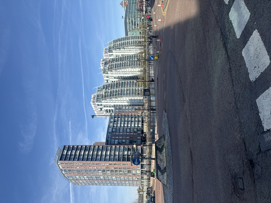 - "The image depicts an urban landscape at Salford Quays, Salford, United Kingdom, under a clear blue sky marked by thin contrails" by FM-SMFX73, licensed under CC BY 4.0