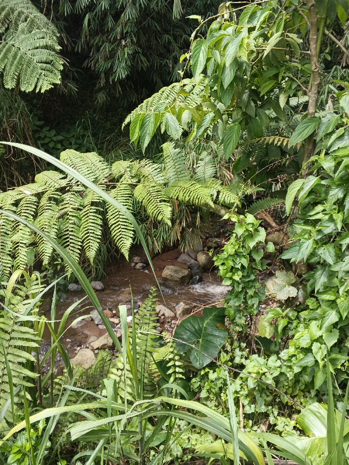 A small stream trickles through a lush green landscape. Ferns cascade over the banks, mingling with vibrant leafy plants and tall blades of grass. Rocks peek through the shallow water, adding texture to the scene. Dense bamboo thrives in the background. Sunlight filters through the canopy, illuminating the verdant growth.