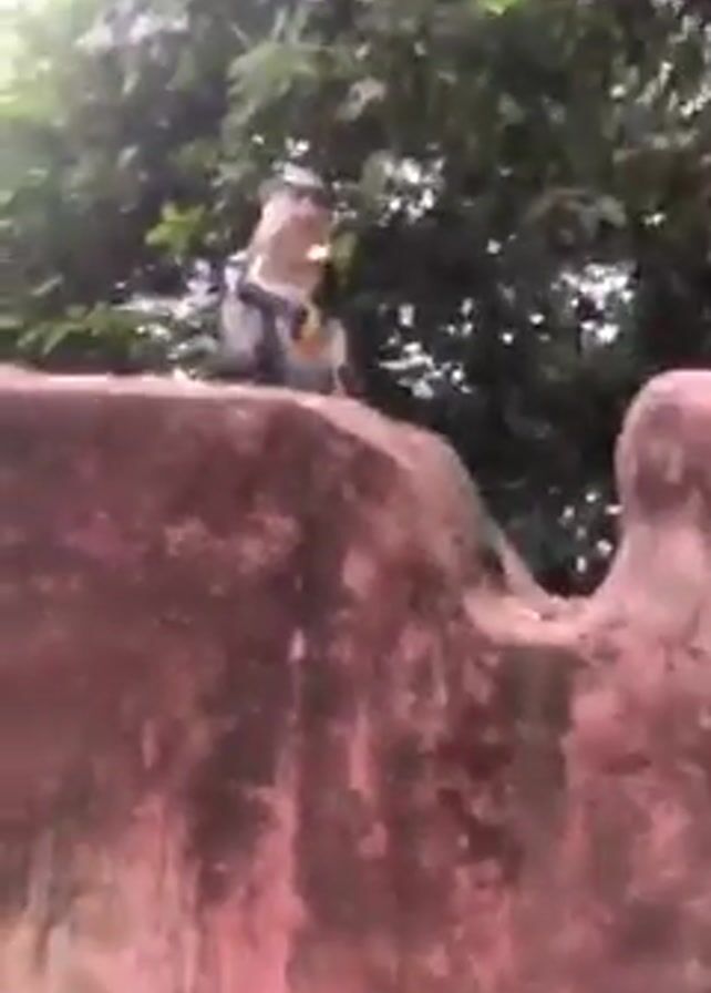 white-throated monkey sitting on a pink cement structure, eating a banana. The monkey is facing the camera and has black arms and legs, and a grey back. The background is a green tree canopy.