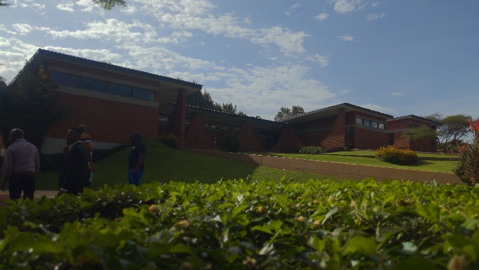 A low-angle shot shows a red brick building complex with a unique, angular roofline against a partly cloudy sky