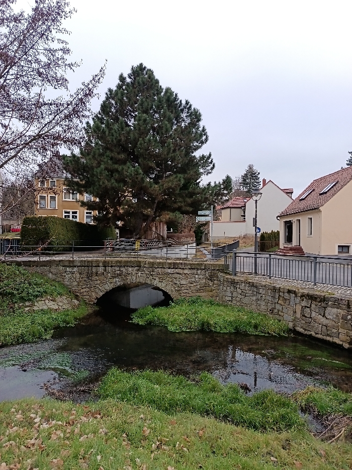 The image presents an outdoor urban scene in Kamenz - Kamjenc, Germany, under a uniformly overcast, light grey sky. A single-arch stone bridge, constructed from rough-hewn blocks, spans a narrow stream that flows from under the arch towards the foreground. The bridge is equipped with dark grey metal railings, featuring vertical bars and horizontal top/bottom rails. The stream's surface is dark and reflective, containing numerous patches of vibrant green aquatic vegetation. The immediate foreground consists of a grassy bank covered with scattered brown leaves. Beyond the bridge, a paved roadway or pathway is visible. To the right, a two-story building with a light beige facade and a red tiled gabled roof features two skylight windows. A dark entrance with steps is visible on its ground level. A black, modern street lamp stands to the left of this building. A prominent, large, dense coniferous tree, likely a pine, with dark green foliage, is centrally positioned behind the bridge, partially obscuring background elements. A white directional road sign with multiple arrows and text is located to the right of the large tree. To the left, a multi-story light brown building with white-framed rectangular windows and a dark gabled roof is partially visible, screened by a trimmed green hedge. Bare branches of a deciduous tree extend from the upper left portion of the frame. There are no individuals or discernible actions within the scene.