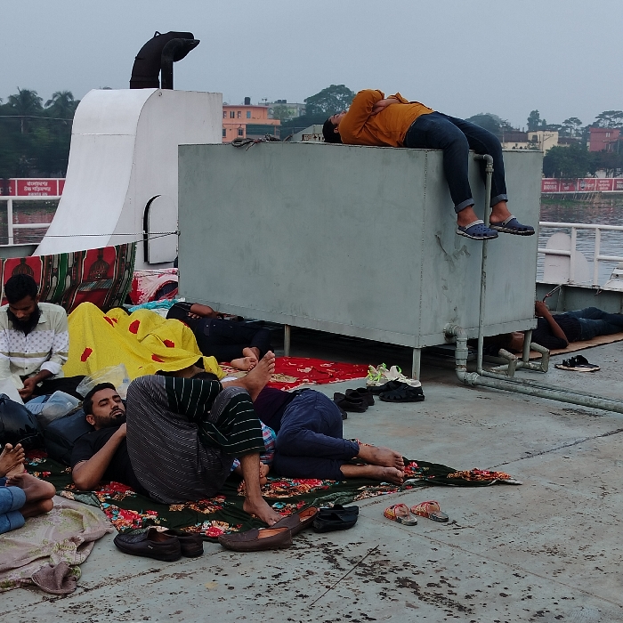 scene on a boat in Munshiganj, Bangladesh (latitude: 23.563, longitude: 90.524). Several people are laying and sitting on the boat's deck, relaxing on colorful blankets. One man is laying on top of a large grey metal box, while another sits with his legs crossed and a young girl is lying on his lap. Two men are sleeping side-by-side on the deck. The boat is docked, and a body of water is visible in the background. The scene appears to be casual and leisurely.