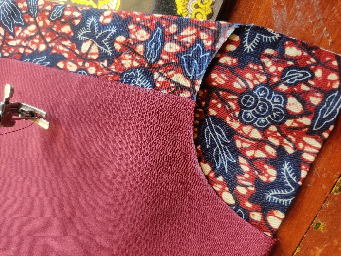 In the city of Unknown, Unknown, a close-up scene details two pieces of fabric positioned for sewing on a wooden surface. The dominant fabric, a maroon-colored textile with a fine, subtly textured surface, occupies the left and upper frame. Underneath and partially overlapping, visible along the right edge and in a distinctive concave arc in the lower-central area, is a patterned fabric. This second fabric features a dark blue background adorned with red, off-white, and light blue abstract floral and leaf-like motifs. A metallic sewing machine presser foot, holding a needle threaded with a red strand, is precisely positioned on the maroon fabric in the upper-central portion, directly above the point where the fabrics meet. The immediate substratum is a worn, light brown wooden surface. A small, blurry section of a sewing machine's yellow and orange decorative detailing is visible at the far right edge of the frame. No individuals are present.