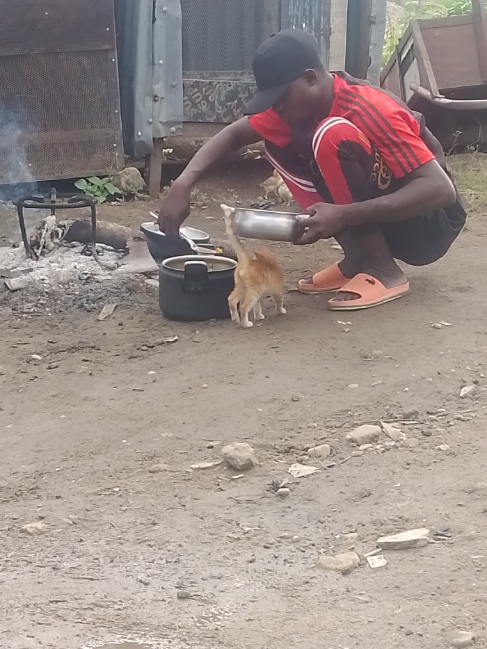 The scene in Adankolo, Nigeria, depicts an outdoor setting with a man, a kitten, and a rudimentary cooking area on dirt ground