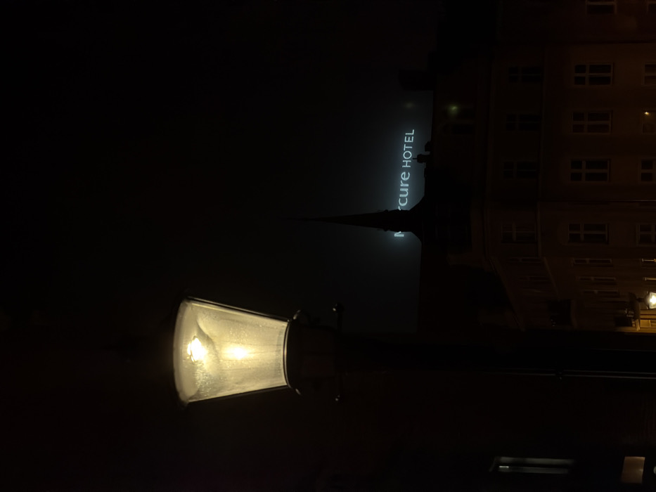 The image presents a nighttime urban scene in Gdańsk, Poland, in the vicinity of the Mercure Gdańsk Stare Miasto hotel. A street lamp on the left, featuring a conical glass enclosure, emits a strong, warm yellowish light from a visible bulb. The lamp's glass appears diffused or slightly dirty. In the darker background, a prominent, slender, dark-colored spire of a building rises. Above and behind this spire, the illuminated signage "Mercure HOTEL" is visible against a dark sky, with the initial letters of "Mercure" partially obscured by the spire. Below the hotel sign, the faint outlines of multi-story buildings with numerous windows are discernible, illuminated by ambient light. No individuals or discernable activities are present in the scene.