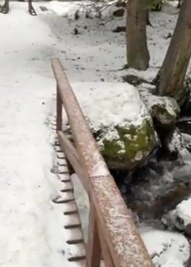 A person crosses a wooden bridge over a rocky creek covered in snow. The camera pans across the winter landscape, capturing the stream flowing amidst snow-covered rocks and trees. The scene showcases a cold, wintry atmosphere with the natural elements of water, rock, snow, and evergreens.