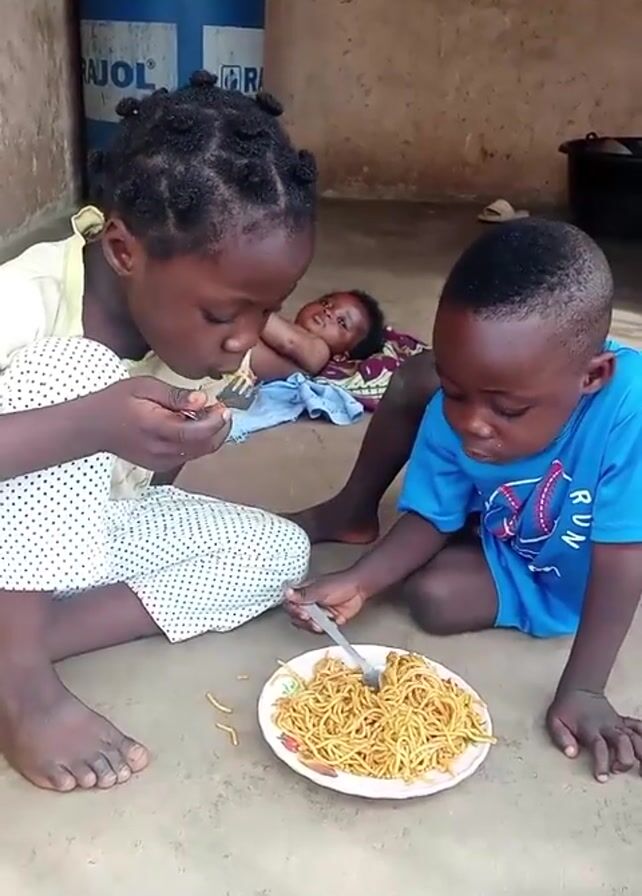 Two children are sitting cross-legged on a concrete floor, eating noodles from a white plate. The girl on the left wears a white and yellow top and white pants with black polka dots, and she uses a fork to eat. The boy on the right wears a blue t-shirt and eats the noodles with a spoon. Behind them, a baby is lying on a light blue cloth. A large blue barrel with white writing is visible in the background. There are also some items of footwear in the distance, and the wall behind the children is a rough concrete.