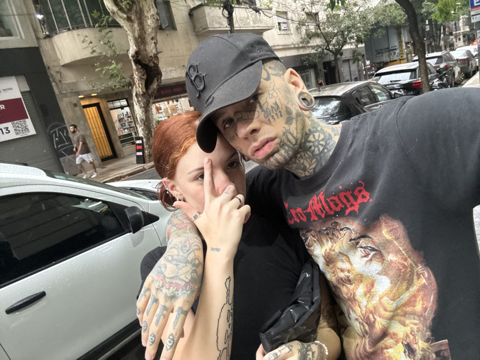A tattooed man and woman pose closely together. The man, wearing a black baseball cap and graphic t-shirt, has extensive facial tattoos and ear gauges. The woman has red hair and tattoos on her hands and arms. They appear to be outside on a city street with parked cars and buildings in the background. Another man is seen walking into a building across the street.